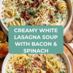Keywords: White Lasagna Soup, creamy soup, bacon soup, Italian soup, comfort food, quick dinner, ricotta cheese soup, spinach soup, lasagna flavors, rotini pasta soup